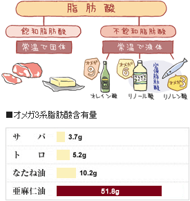 | 平成17年4月、厚生労働省が改定した「日本人の食事摂取基準」ではオメガ3系脂肪酸が増やすべき栄養素に指定されています。この脂肪酸(油)を補うことで、コレステロール・中性脂肪の低下、血栓症防止作用など、いろいろな生理作用を介して生活習慣病の予防になることや、脳卒中、肥満、糖尿病、ガン、アレルギーへの予防効果があることなどが示唆されています。さらに摂取割合を増やすことで、女性ホルモンの材料を蓄えることができ、ひいては更年期障害の軽減にもつながるなど、様々な保健機能があることが学会で報告されています。