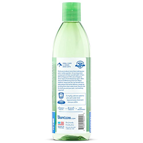 Oral care is about more than making your pets’ smiles sparkle—it’s an important component of their overall health. In fact, 80% of dogs and 70% of cats begin to show signs of oral disease by age 3. With Advanced Whitening Oral Care Water Additive, dogs and cats can benefit from daily plaque and tartar defense, simply by drinking from their water bowl. Easy to use for both you and your pet—no brushing required!.Feature