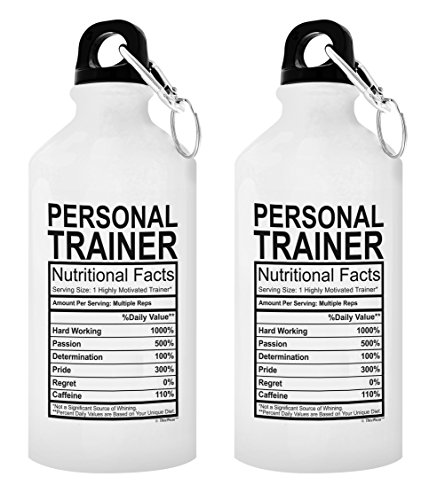 A funny Personal Trainer water bottle makes a great Personal Trainer birthday gift. Personal Trainer water bottles make great Personal Trainer gifts for men or Personal Trainer gifts for women. A Personal Trainer themed gift is sure to get a laugh from any Personal Trainer. This white aluminum water bottle holds 20 ounces of hot or cold liquid, and includes a carabiner clip screw-top for your convenience. This aluminum water bottle is a perfect travel size bottle for taking to sporting events, enjoying outdoor activities, or keeping hydrated at the office. The convenient size makes this portable water bottle a perfect water bottle for women, water bottle for men, or kids water bottle. In addition to bottled water, this lightweight water bottle is perfect for holding ice cubes. The imprinted design will display on both sides of the water bottle as pictured. The premium full color sublimation imprint creates a vibrant, long lasting, and lead-free design. Handwashing is recommended.Feature