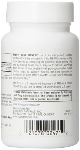 -. Binding : Health and Beauty -. Brand : Source Naturals -. Department : Natural Health -. EAN : 0021078024712 -. Feature : A natural protein complex contained in trace amounts in milk / Promotes healthy bone density by increasing the growth of bone-forming cells and by making bones more receptive to calcium / Mbp has been shown in four double-blind, placebo-controlled human clinical trials to support healthy net bone formation in women of all ages after 6 months of use / Should be taken once daily / Contains milk / Increases the activity of bone building cells / Makes bones more receptive to calcium / Comes in a small capsule taken once daily -. IsAdultProduct : 0 -. Label : Source Naturals -. Manufacturer : Source Naturals -. Model : SN2471 -. MPN : SN2471 -. NumberOfItems : 1 -. PackageQuantity : 1 -. PartNumber : SN2471 -. ProductGroup : Health and Beauty -. ProductTypeName : HEALTH_PERSONAL_CARE -. PublicationDate : 2015-11-23 -. Publisher : Source Naturals -. ReleaseDate : 2015-11-20 -. Size : 30 Count -. Studio : Source Naturals -. Title : Source Naturals MBP Bone Renew, Advanced Bone Density Support -. UPC : 021078024712