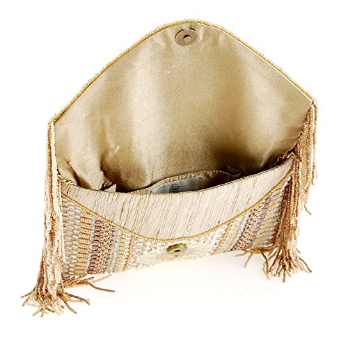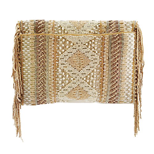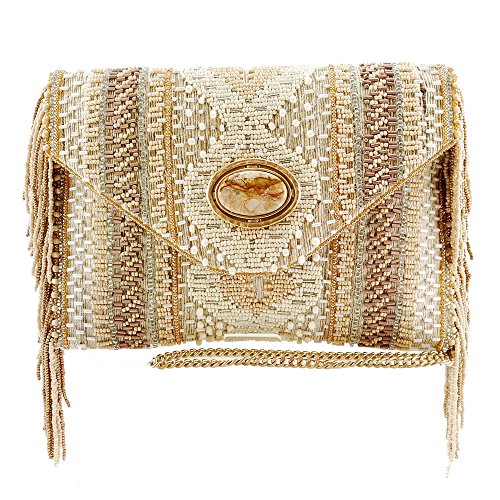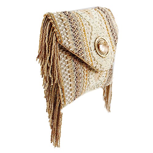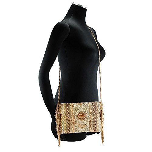 - Beach side glamour. This sandy colored bag has rich details and a super chic fringe! Dimensions: 9 x 0.5 x 7", Strap Length: 46, Strap Drop: 23, Features: Magnetic flap closure, removable crossbody chain strap, inside slit pocket, back slit pocket, fits a cell phone