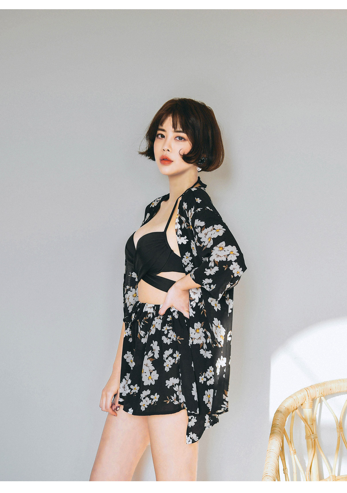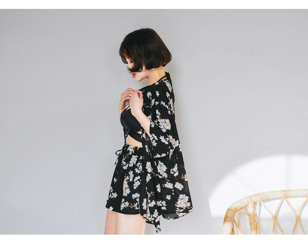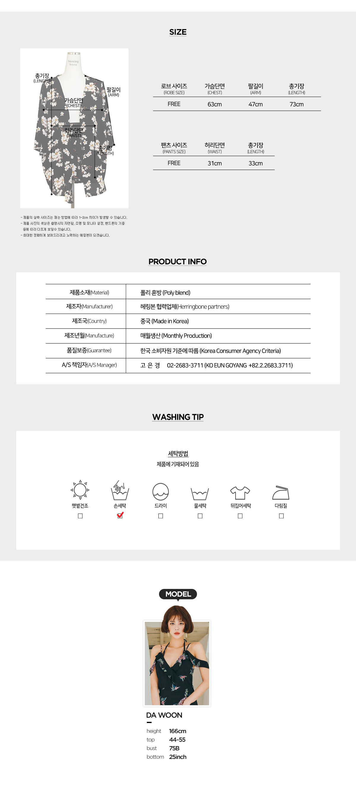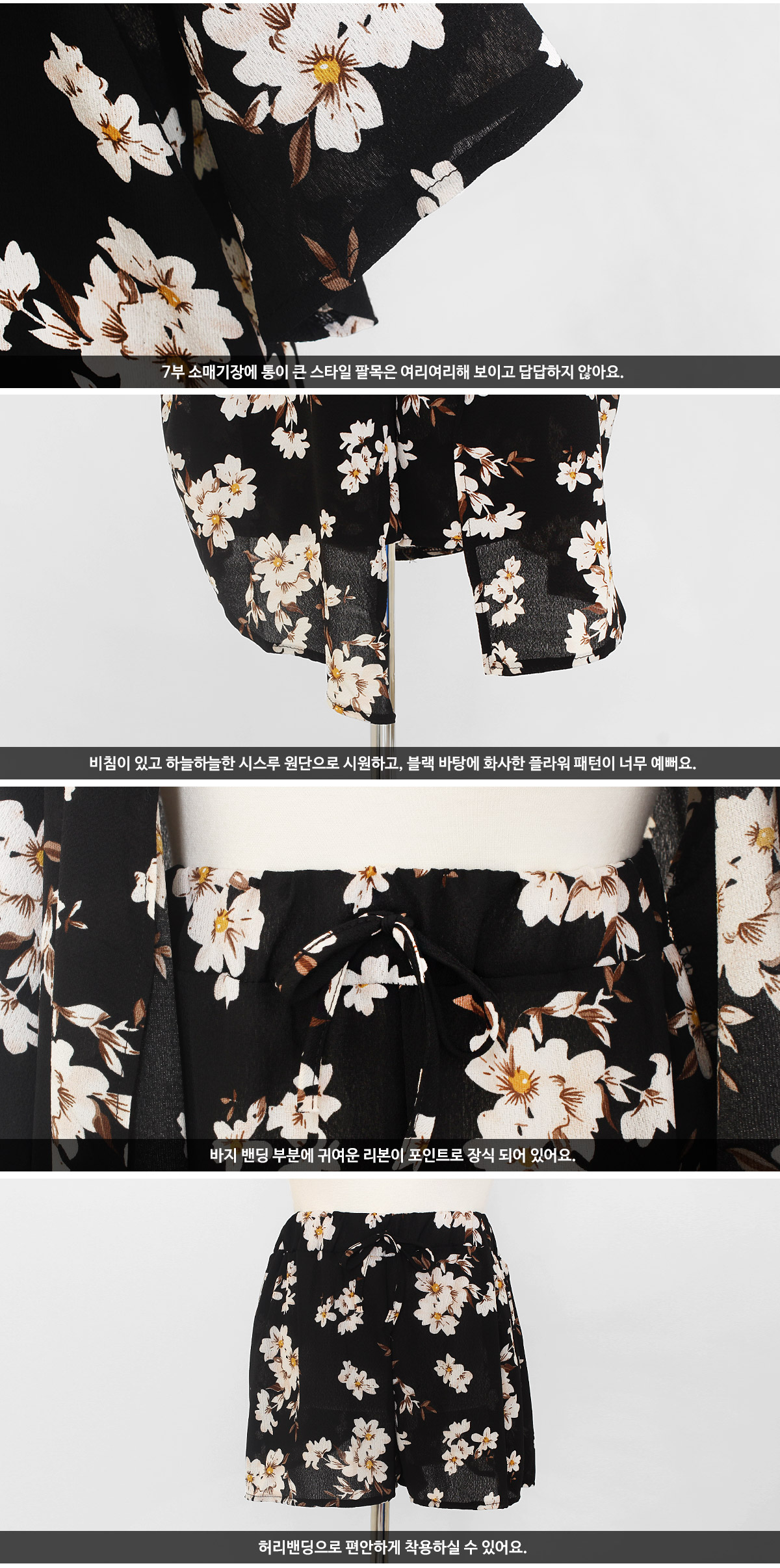 블랙 바탕에 화사한 플라워패턴 조합이 너무 예쁜 로브와 팬츠 SET예요.