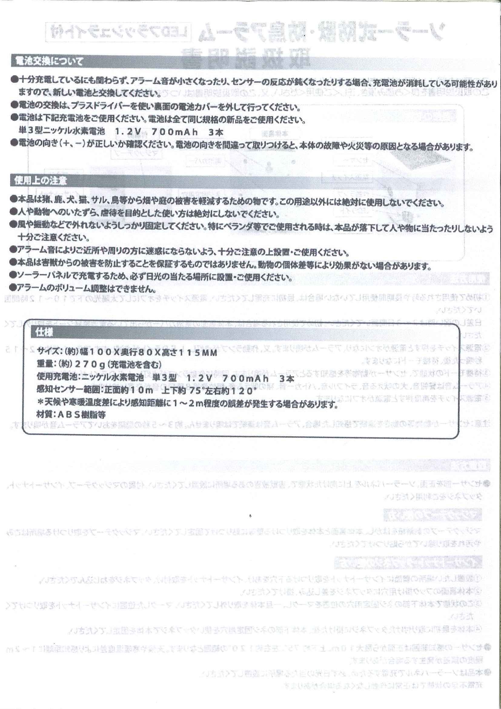 Prevent intimidation and entry by light and eight types of warning sounds for large pests such as boars, deers, monkeys, birds, and wild birds.