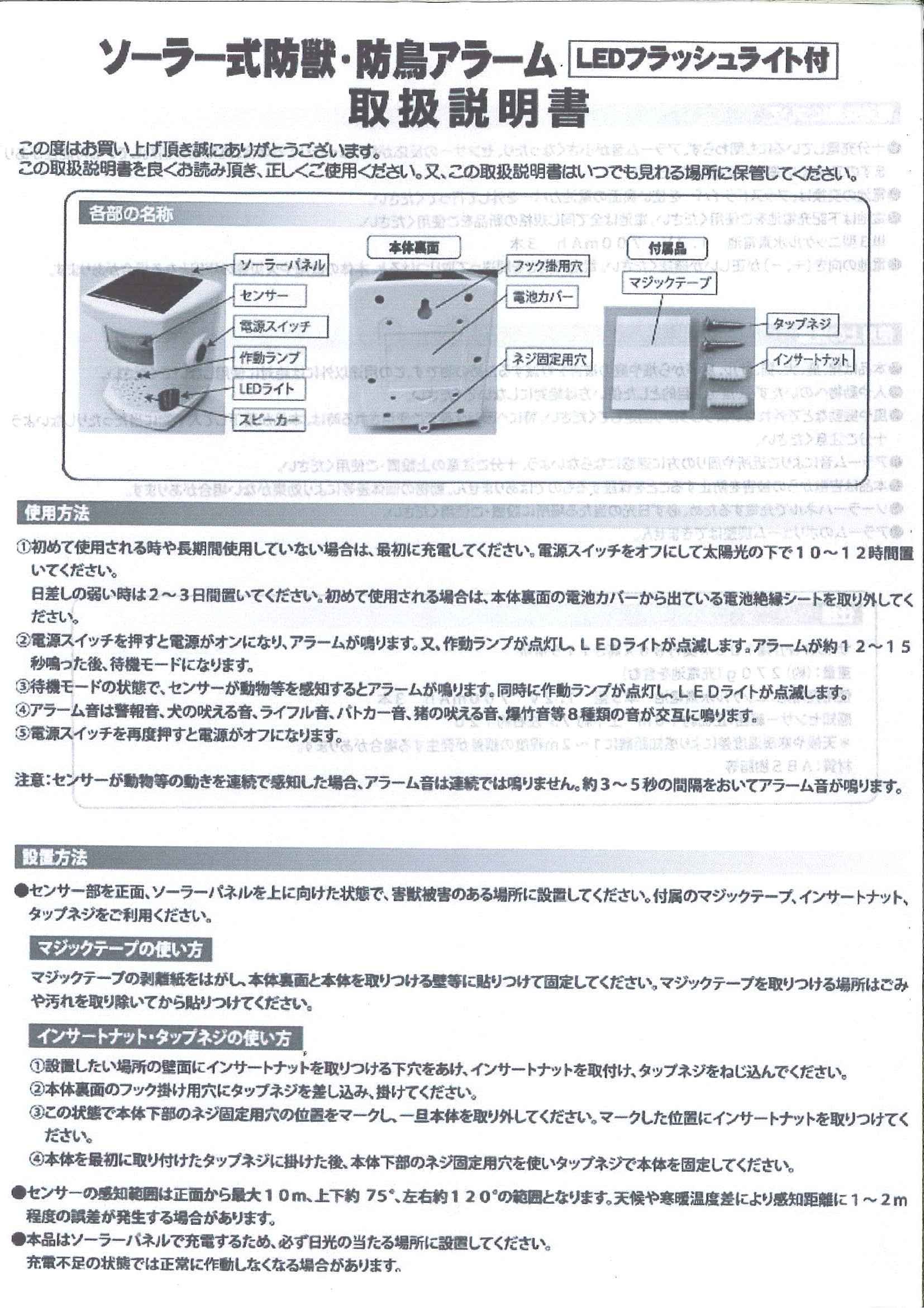 Because it uses a sensor formula to ring eight kinds of warning sound at random, it prevents accustomed animals.