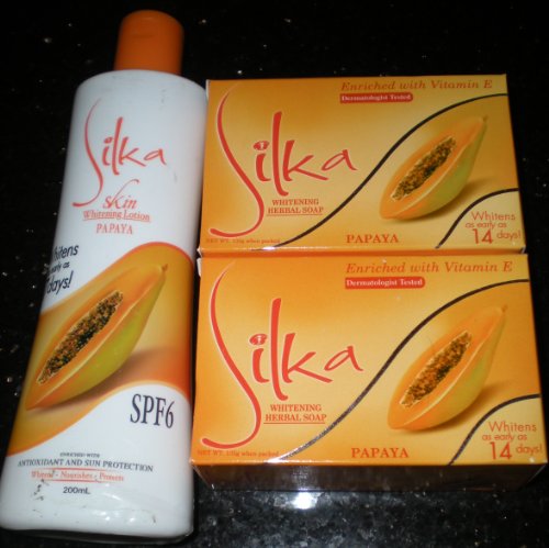 -. Feature : Silka Papaya Set of 2 Bars of Soap & 1 Bottle of Lotion / Silka Soap & Lotion Combination works perfectly on all skin types / Natural Herbal Whitening, Anti-Aging and Smoothening Effect / Safe Proven Effective, Dermatologist Tested Products / Save in Shipping Charges by buying Sets