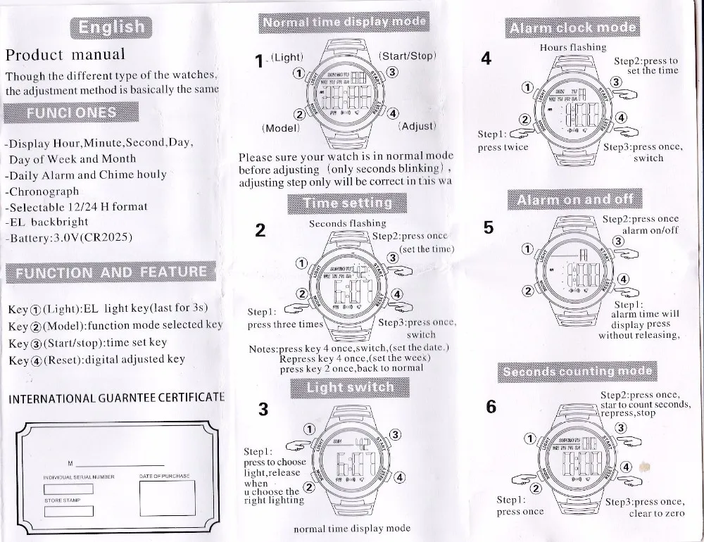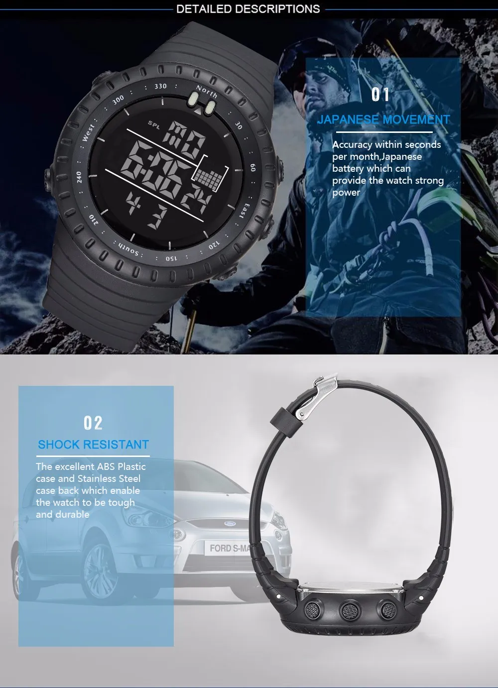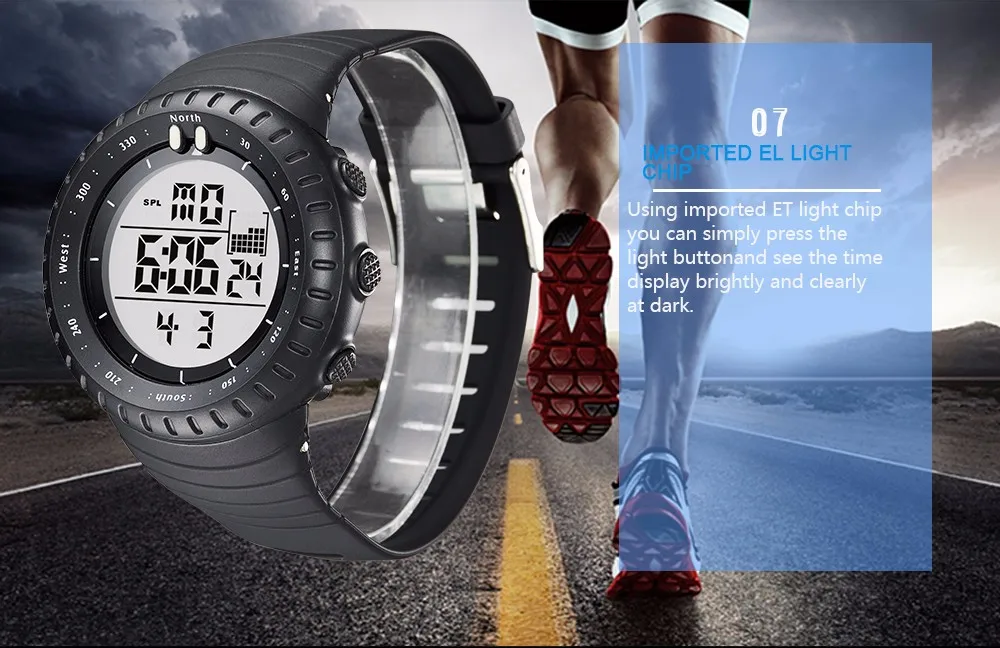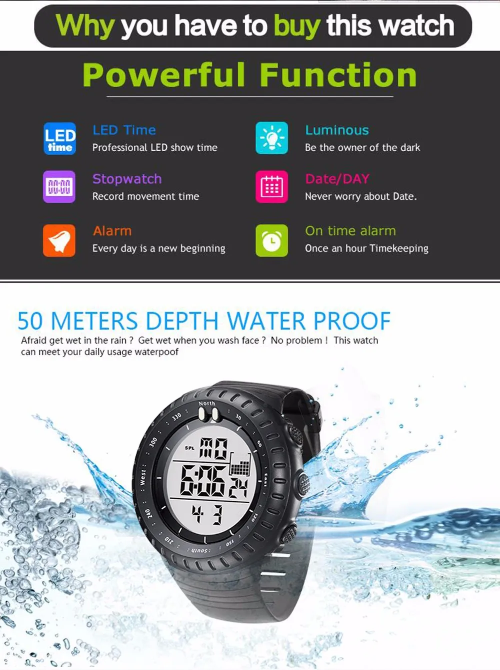 Feature:Alarm,Back Light,Water Resistant,Shock Resistant,Complete Calendar,Chronograph,Auto Date,LED display