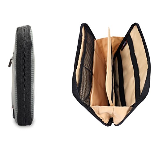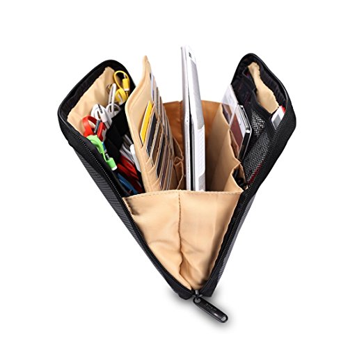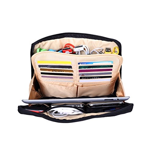 Elastic loops to hold various items like cables, cell phones, passport, cards, pens, cosmetics and etc; Enough interior pockets keep your hard drive, adapters, cell phone, card, cash, passport, etc; And more, this organizer bag can hold your iPad (also fits iPad with smart cover) and tablet. It is Universal.