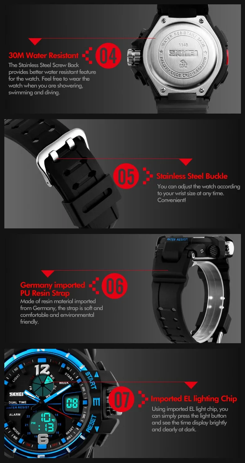 Feature:Water Resistant,LED display,Multiple Time Zone,Auto Date,Complete Calendar,Back Light,Shock Resistant,Alarm,Chronograph