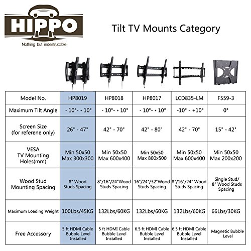 -. Binding : Personal Computers -. Brand : HIPPO -. Color : Black -. EAN : 6801649419697 -. Feature : Universal Open Plate Design: Fits most 15"- 37" (some up to 47") monitors weighing up to 100 lbs, VESA up to 300x300mm. Fits TVs with mounting holes as close as 2"x2" or as wide as 12"x12" (VESA 50x50mm to 300x300mm) / Tilt and Profile: -10°~ +10° tilt for better viewing and reduce window glare. Place your TV 2.6" from the wall, leaving easy access to cables and cords / Safety Lock with easy pull down strips: Secures your TV in place from accidental lift off / Heavy gauge steel construction provides 100 lbs loading capacity. VESA plate can be taken off for easy installation by one person / Quick and easy installation: Fits 8" wood studs plus concrete wall, with all hardware included and pre-divided. (5 ft high speed braided HDMI cable included) -. Label : HIPPO -. Manufacturer : HIPPO -. ManufacturerPartsWarrantyDescription : Replacement parts provided free the first year. -. Model : FBA_HP8019 -. MPN : FBA_HP8019 -. PackageQuantity : 1 -. PartNumber : FBA_HP8019 -. ProductGroup : CE -. ProductTypeName : COMPUTER_COMPONENT -. Publisher : HIPPO -. Studio : HIPPO -. Title : HIPPO TV Wall Mount Tilting Bracket for Most 15" 17" 19" 20" 22" 23" LED LCD Plasma Flat Screen TVs up to 100 Lbs VESA up to 300x300 Security Lock 5 ft HDMI Cable