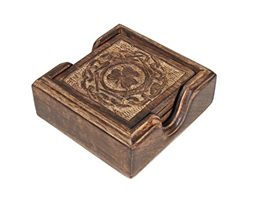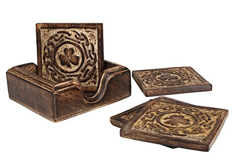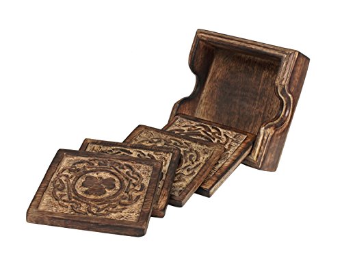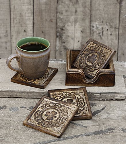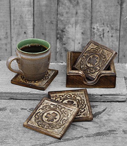 -. Feature : Dimensions : Coaster Length -3.5inches X Width - 3.5inches &Coaster holder Length -4.5 inches x Height -3 inches x Width -3.5 inches / A charming table accessory for your home, this set of 4 coasters is hand carved in sustainable mango wood, known for its beautiful color and finish. / Embossed with a clover leaf design these set of coasters make for a great gift to give friends. / Functional and decorative, these coasters are perfect for use at home or at offices, adding a classic touch to your tabletops. / Handmade by skilled artisans from Saharanpur - India's largest hub for high quality wooden handicrafts. By purchasing this product from Store Indya, you will help sustain the 1,000 year traditions of handmade artistry of ethnic artisans living off the heartland of India, as we will donate 10% of our profits to train a new generation of artisans with modern techniques of craftsmanship.