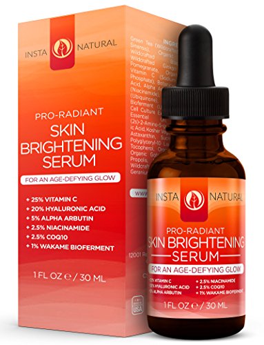 -. Feature : ILLUMINATE YOUR SKIN FOR A RADIANT NEW LOOK - InstaNatural's Skin Brightening Serum is a powerful lightening blend that contains 25% of Vitamin C to help tackle uneven and hyper-pigmented skin on the face and neck. Provides superior antioxidant protection against free radical damage and helps restore the skin to a younger and more radiant state. It's time to get your glow back! / UNBEATABLE SKIN BRIGHTENING BENEFITS - This high-powered serum features only the highest quality skin lightening agents such as 20% Hyaluronic Acid, Alpha Arbutin and Niacinamide (B3) to keep the skin glowing and vibrant, while also acting as a potent moisturizer to help reduce fine lines, wrinkles and crow's feet for a smooth and supple appearance. No more wondering how to get rid of dull looking skin! Your solution is right here, right now! / AS SEEN IN SHAPE MAGAZINE - Even Shape Magazine agrees that when it comes to getting your skin's glow back, InstaNatural's Pro-Radiant Skin Brightening Serum is the way to go! If you want amazing 'before and after' results, this is the proven way to brighten your skin, so now it's time to find out for yourself! / A PREMIUM SERUM YOU CAN TRUST - Each bottle of Pro-Radiant Skin Brightening Serum is comprised of amazing natural and organic ingredients that are made in an FDA registered facility, and bottled in the United States. With InstaNatural, rest assured that your skin is safe with us. / CONQUER SIGNS OF AGING WITH EASE - Looking for nourishing anti-aging nutrients that can restore your collagen, elasticity and firmness? Then this is the product you've been looking for. Thanks to the power of Coenzyme Q10, you will be able to repair rough, dry, wrinkled, blotchy and sun damaged skin to keep the face looking soft and healthy.
