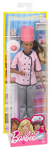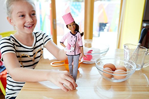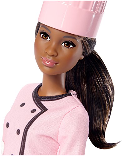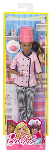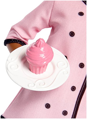 Dream big with Barbie career dolls! Barbie doll can take on any goal, and this cupcake chef doll aims to rise to the top! Baking, measuring and an artistic eye are the key ingredients to the perfect sweet treat. Barbie cupcake chef doll is ready to create sweet treats wearing a career-themed outfit complete with accessories that enhance storytelling. Barbie cupcake chef doll is ready to bake wearing a pink baker’s coat with black trim and buttons, black and white checkered pants and black shoes. Her long brown hair is pulled back in a ponytail under a pink chef’s hat. And a pink cupcake on a plate helps Barbie cupcake chef doll sweeten anyone’s day! Young bakers will love cooking up sweet stories because with Barbie, you can be anything (each sold separately, subject to availability). Includes cupcake chef Barbie doll wearing fashions and accessories, plus cupcake on plate. Doll cannot stand alone. Colors and decorations may vary.Feature