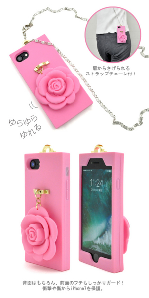 大きめローズの立体チャームがゆらゆらゆれるiPhione7用シリコンケース。