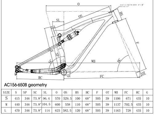 Size S(you can see other size geometry on the photo) Top Tube (effective): 570mm Seat Tube (BB Center to Top): 415mm Chain Stay (actual): 435mm Seat Tube Angle: 73.8¡a Bottom Bracket Drop: 10mm Head Tube Length: 100mm Head Tube Angle: 68¡a Fork offset: 39mm Wheelbase 1106mm
