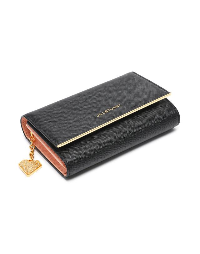 내부 베이비 핑크 배색으로 여성스럽고, 심플한 외관을 보여주며, 하단의 로고와 골드 바장식으로 포인트를 준 3단 중지갑입니다.