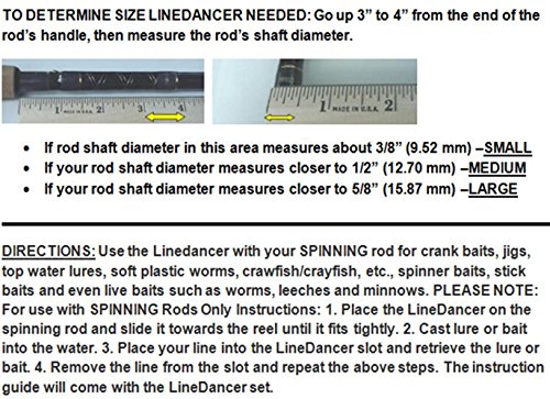 The LineDancer can help you catch fish in fresh and saltwater: bass, walleye, trout, crappie, salmon, catfish, bluegill/bream many other fish species. Made of strong, durable Stainless Steel. Compact device is easily stored and will last a very long time. In the drop-down list: Choose from either the 3 piece pack (includes: 1 small, 1 medium and 1 large LineDancer) or from our SINGLE sizes of 1 Each of small, medium or a large LineDancer. Color may vary from photo.Feature