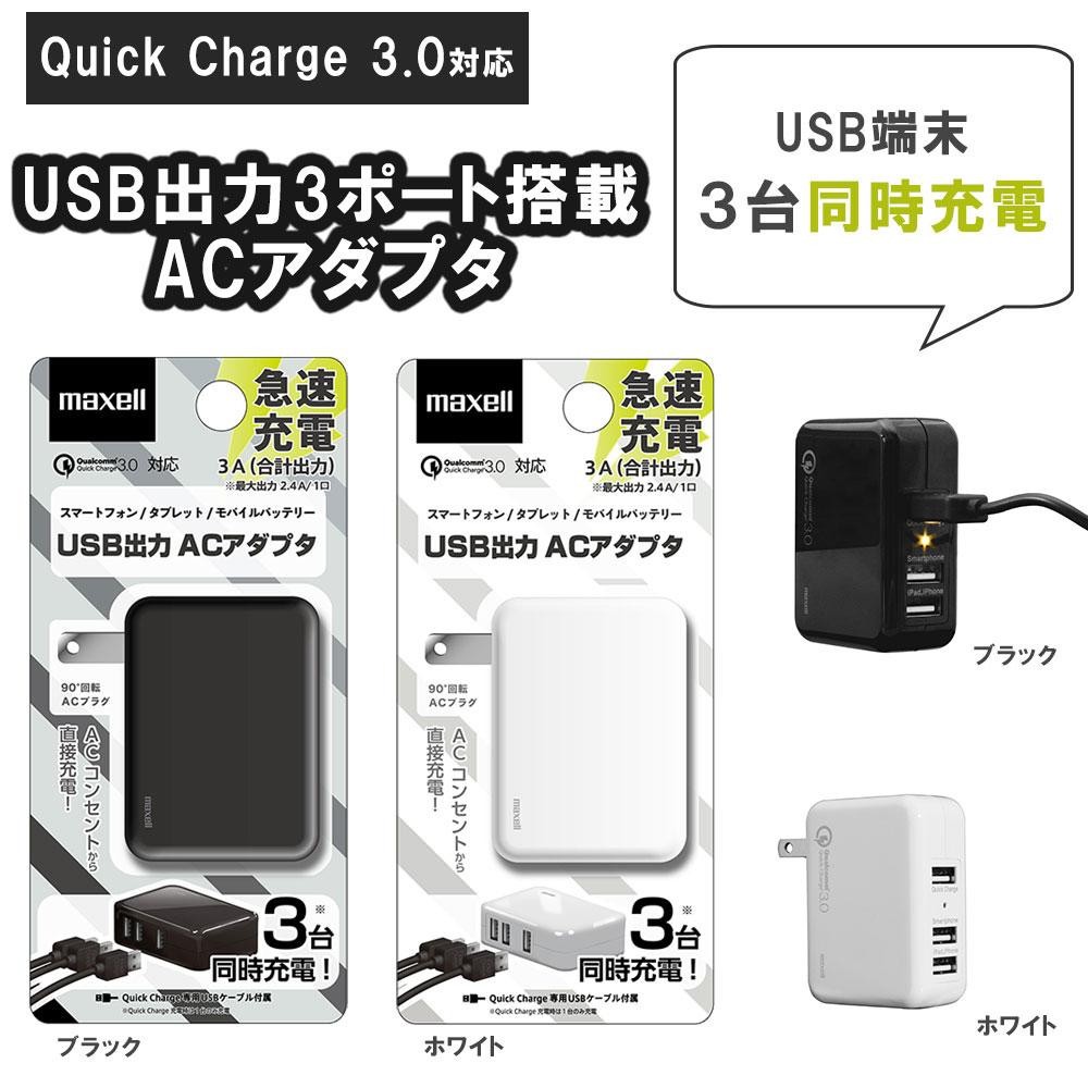 Quick Charge 3.0対応でスマートフォンを急速充電! 製造国:中国 商品サイズ:幅68×奥行28×高さ50mm(突起部を除く) 重量:約70g 付属品:Quick Charge専用USBケーブル(約50cm)、取扱説明書(保証書付、保証期間:3ヵ月) ※サプライヤー直送品  ご注文後3~4営業日後の出荷となります【商品名】マクセル USB出力3ポート搭載ACアダプタ 3A ブラック・MACA-T03BK