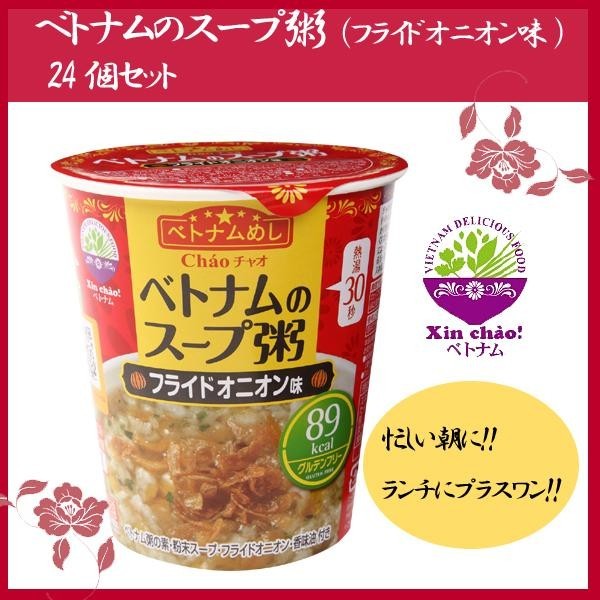 ダシの効いたスープでふわとろっ食感のお米を食べる、ベトナム定番の人気メニュー「チャオ」(スープ粥)をカップタイプにしました。お湯を注いで30秒かき混ぜれば出来上がり。カップタイプなので、お湯さえあれば簡単に召し上がれます。食欲をそそる香ばしいフライドオニオン味です。 |