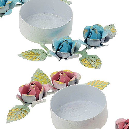 PINK AND BLUE BEAUTY This metal tea light holder features pink and blue iron flowers surrounded by striking, matching beads