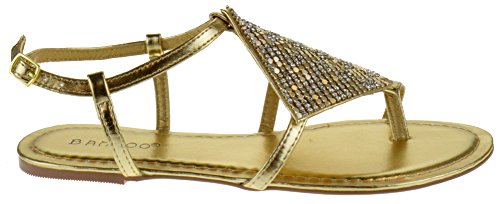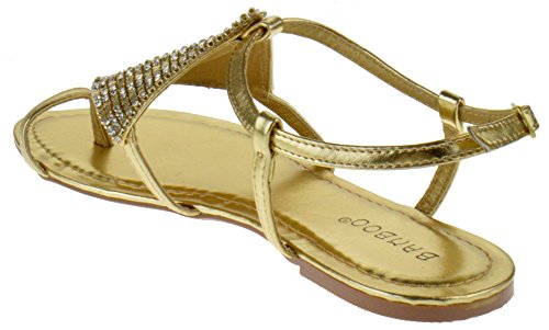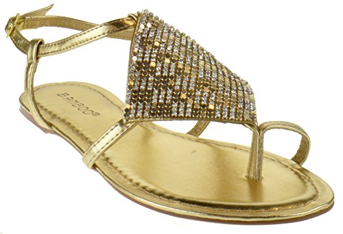 Product DescriptionFemininity and simplicity is yours in these luminous flat sandals! Featuring gladiator straps with sparkling jeweled embellishment, and adjustable slingback strap with buckle closure.0