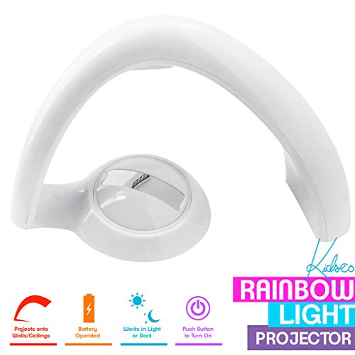 -. Feature : KIDSCO NOVELTY Amazing rainbow, Timer Great gift for young girls and boys or friend Projects across the walls and ceiling Battery supply power operated Easy to operation and instruction in package / FASHION DESIGN, LIGHTING Uses-Multi- colored Magic Romantic via 5 LED's bulbs, which makes the rainbow much brighter, more realistic and more colorful than the previous editions Turns on with the push of a button Turns on with Projects across the walls and ceiling See a magical rainbow come to life on the walls or celling / POWER SOURCE: TWO KINDS OF POWER SUPPLY: Battery supply power, use it anytime and anywhere, traditional power, just for optional AC adapter - Requires 4 AAA batteries (INCLUDED), Jack for optional AC adapter (NOT INCLUDED), AUTO OFF FUNCTION: The light will turn off automatically after 10 minutes, touch the button, it will light up again, use anytime and anywhere, 2 modes: turns rainbow on at once, turns rainbow on one color after another, saving energy, / APPLY TO DIFFERENT PLACES: Good for bedroom, hotel, corridor, and showroom. Always bring you romantic / AUTO ON/OFF FUNCTION Auto shut-off after 10 minutes, when your kids fell asleep, don't worry the rainbow light is on all night, to turn it back it back on touch the button, it will light up again