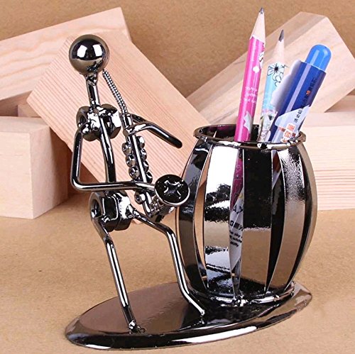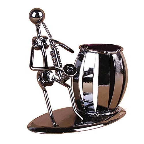 - Desktop organizer pen holder featuring a barrel-shaped pencil holder next to a metal man is blowing saxophone.This is a very unique fashion personality gift, suitable for any occasion as a gift to a friend.