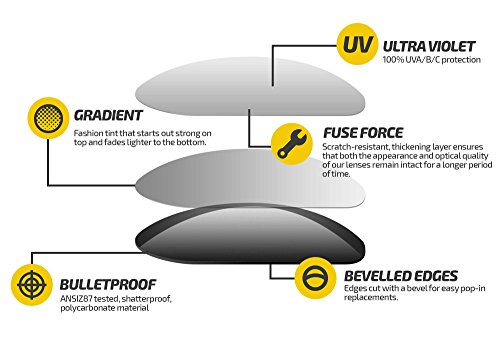 All of our lenses offer 100% UV protection, impact resistance that exceeds ANSI Z80.3 and EN 1836:2005 standards, multiple layers of the most intense and rugged hard coatings and hydrophobic coatings to keep your lenses clean and protected and, of course, a 100% money back satisfaction guarantee.