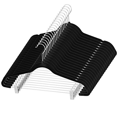 Zober Premium Quality Space Saving Velvet Pants Hangers Strong and Durable, with Metal Clips - 360 Degree Chrome Swivel Hook - Ultra Thin Non Slip Skirt Hangers, with Notches, Black - 20 pack
