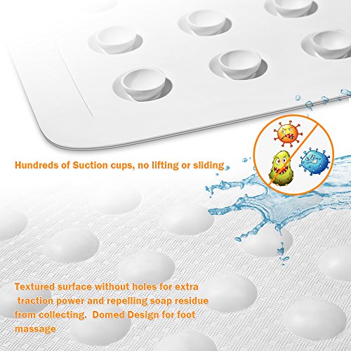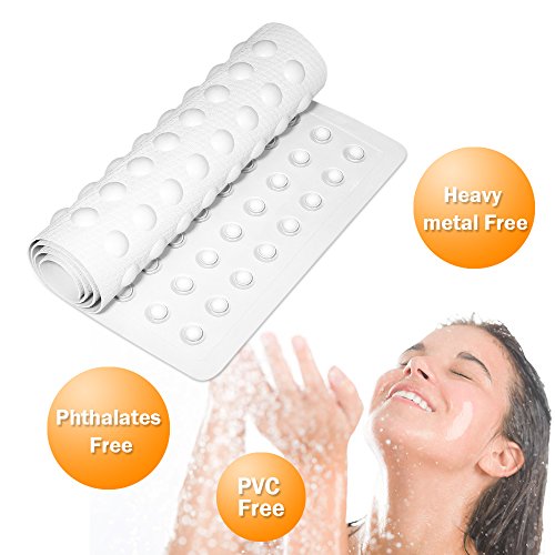 - The bath mat grips the floor with plenty of suction cups and has a textured surface, so an adult or child will be safer in the tub or shower. - Simple design, the pure white color matches any decor and is easy to clean. -The natural rubber material is non-toxic, and it has the perfect feel, does NOT slip, slide or move once you place it down. - This extra large mat is a good size for a tub, comfortable both underfoot and under bottom when taking a bath. -This bath mat is a great choice for the home, gym, spa and Many Other Places Attention: Whether rubber-backed or not, a bath mat should be hung up over the tub or somewhere else after use so that air can circulate underneath the mat to avoid mildew. The rubber bath mat that remains in the tub should be cleaned regularly on the bottom and top to prevent mildew and dirt and soap build-up. If you have a textured bathtub floor, please do not purchase this as it only will work on smooth surfaces. 0