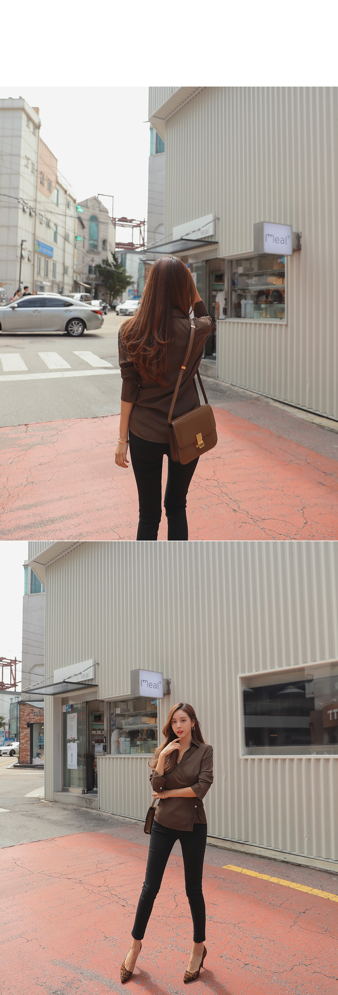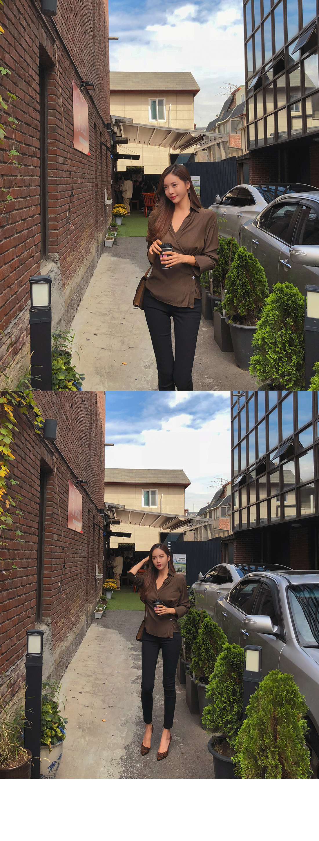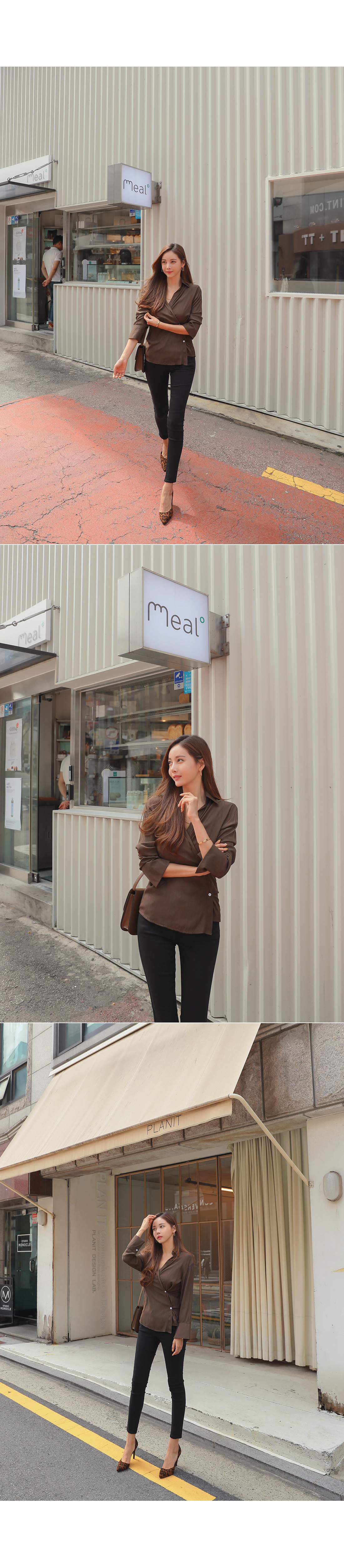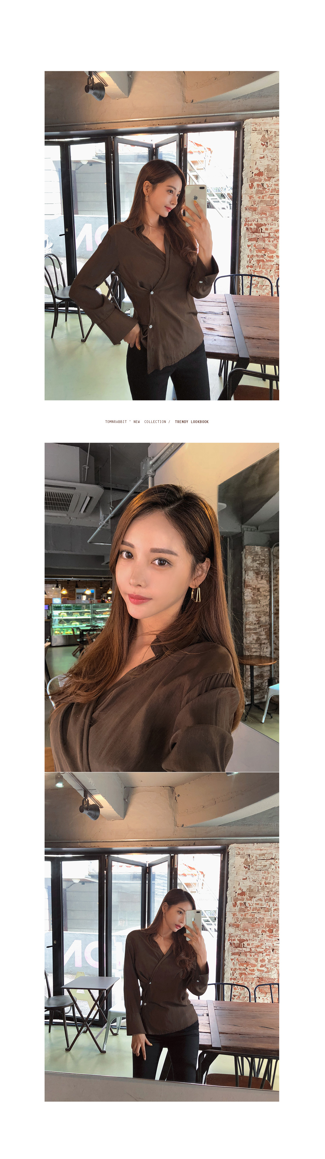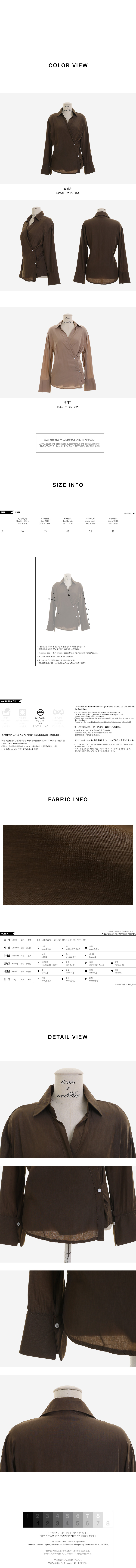 MD COMMENT 세련된 분위기를 연출해 줄 랩 블라우스를 소개할게요.기본 카라 디자인에 랩 스타일로 제작된 아이템이구요.전체적으로 은은한 광택감이 감도는 소재감으로 은근 고급스러우면서 세련된 무드를 가져갈 수 있어요.적당히 여유있는 핏과 기장감으로 부담없이 즐겨입기 좋구요.부드러운 터칭감의 폴리 소재로 바디에 닿는 느낌이 좋아기분 좋은 착용감을 느껴볼 수 있답니다^^안쪽에 단추 버튼으로 고정할 수 있어 안정감있게 착용이 가능해요.고급스러운 소재감에 베이직한 컬러들로 구성되어기본 하의 아이템과 매치해도 센스있는 스타일링을 연출해 줄블라우스 아이템으로 추천해요!오픈클로징은 프론트 단추버튼으로 도와드려요:)COLOR/SIZE 브라운,베이지FREEMODEL FITTING 브라운/FREE