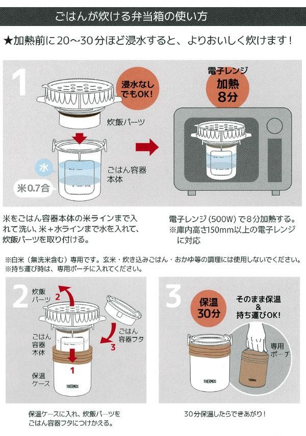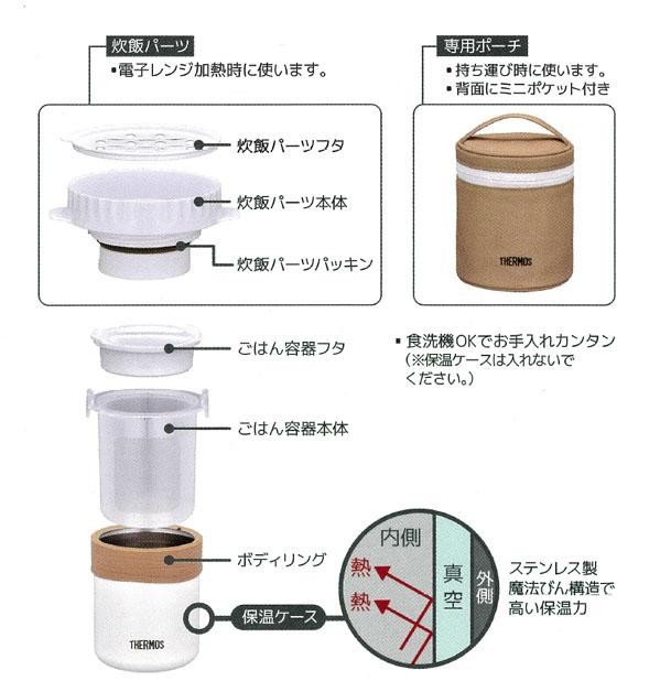 | 仕様 | ●実容量:0.36L ●茶碗1.6杯(約0.7合)炊飯可 ●丸洗いOK ●食洗機・乾燥機:可(保温ケース以外) ●電子レンジ:可 ●保温効力(6時間)/保温ケースのみの場合:54度以上 ●保温効力(6時間)/保温ケースを専用ポーチに入れた場合:57度以上 |