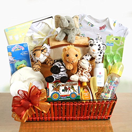 -. Feature : This adorable Noah's Ark baby gift basket is truly one-of-a-kind. / This baby gift is filled with 6 cuddly animals ready to greet the new little one. Also included are loads of baby essentials: a baby bib, baby t-shirt, baby hat, baby bottle and bubble bath. / This one-of-a-kind baby gift basket makes for a great baby shower idea! / Include a free personalized gift message for your clients, friends, and loved ones