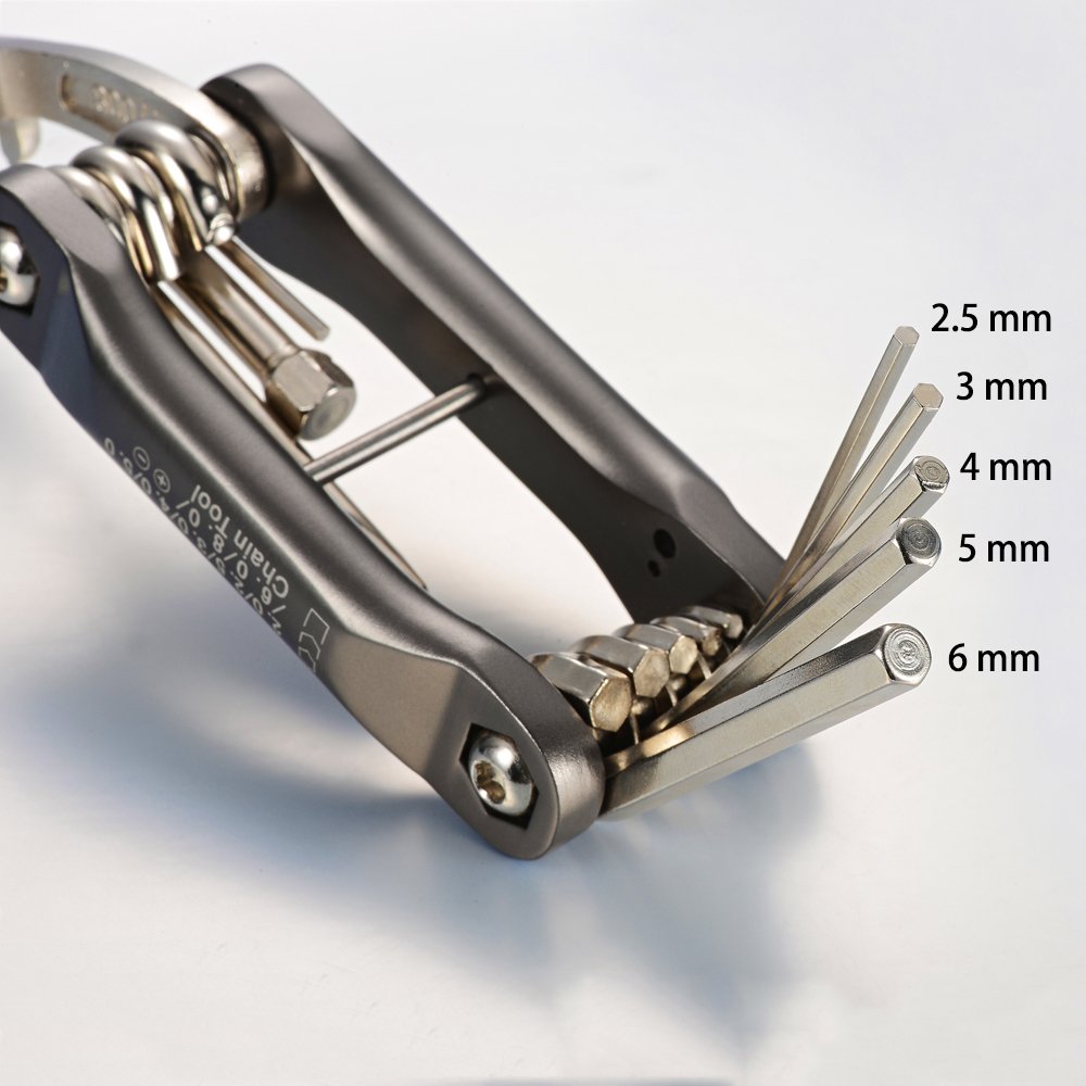 10 in 1 Tools: Allen wrench (2 / 2.5 / 3/4/5/6/8), cross screwdriver, straight driver, chain tool
