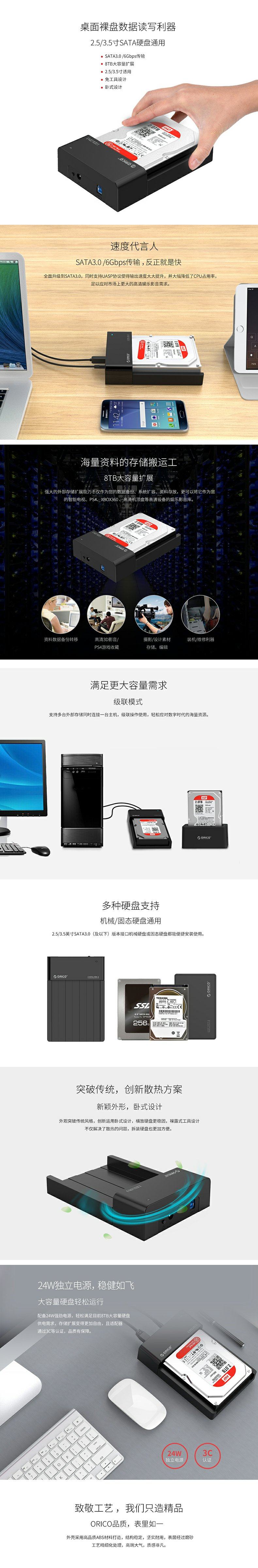 Orico 6518SUS3卧式外置硬盘,采用ABS塑料打造,结构简单耐用,卧式设计便于携带,支持2.5"SSD/3.5"HDD,支持热插拔功能。