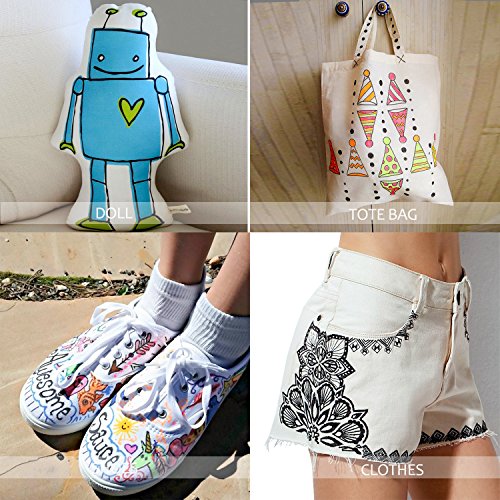 - APPLICABLE ON ALL TYPES OF FABRIC WITHOUT BLEEDING: Made with water-based ink, these Fabric Paint Markers work well on many types of fabric including Denim, T-shirts, canvas, cotton, polyester, etc. Besides, they can also be used on paper, plastic or wooden surfaces and walls.