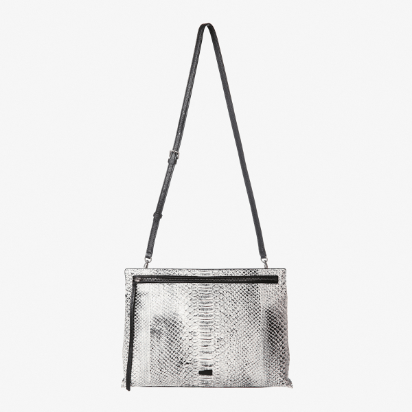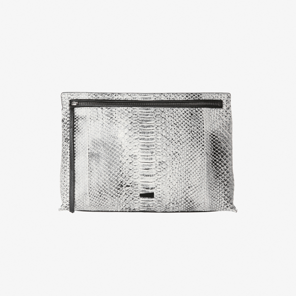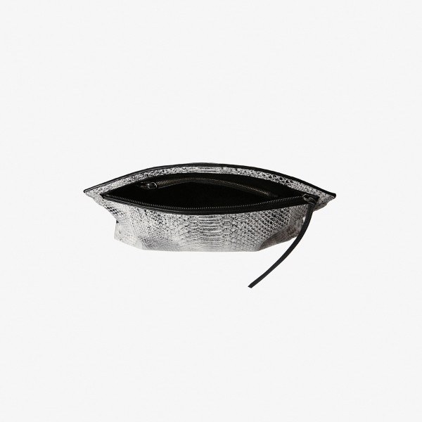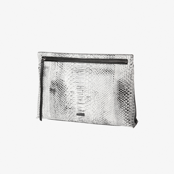 18 S/S 시즌 처음 선 보였던 루스트리노 클러치의 신규 버전입니다. 기존 루스트리노 클러치는 지퍼를 보이지 않기 위해 클러치 상단에 후다 (지퍼덮개)를 대어 금속이 보이지 않도록 하였다면, 이번 시즌 새롭게 나오는 루스트리노 클러치는 상단의 지퍼덮개를 빼고 금속지퍼가 보이도록 하여 기존보다 디자인이 심플하고 시원해 보이도록 하였습니다. 소재는 꾸준히 인기있는 소재인 아테나 화이트, 리얼스네이크 화이트(블랙브러쉬), 패치워크 램 을 사용하여 3스큐 진행하였습니다. 내부 수납공간: 지퍼 포켓 1개