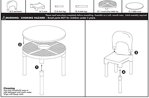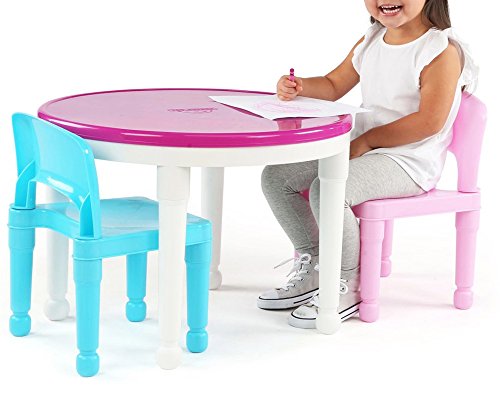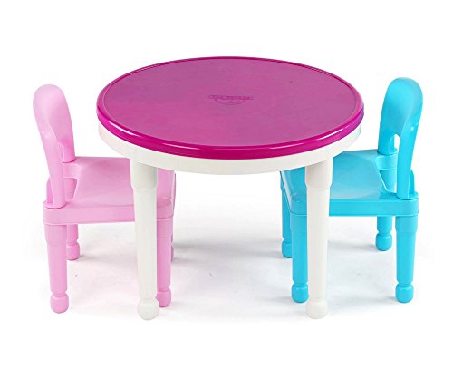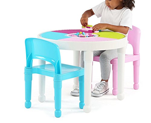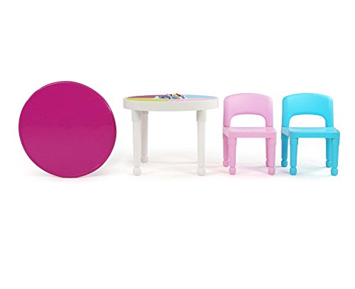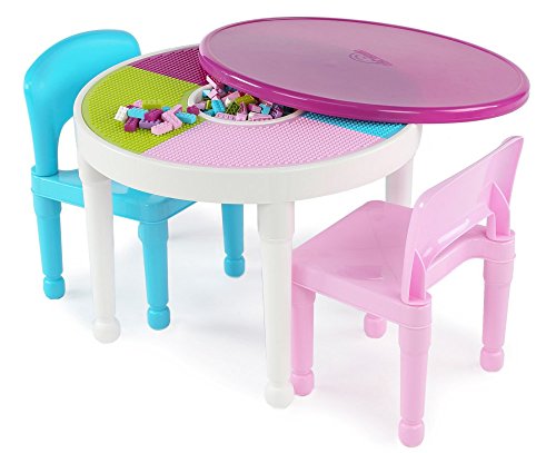 Studio : T. Tutors Publisher : T. Tutors Product Description Sleek and chic, this kids storage table and chair set is the perfect choice for kids to do arts and crafts, play with their favorite toys, tea parties and more. This Activity Table and Chairs Set has removable translucent purple tabletop and reveals a construction table for use with LEGO blocks, Duplo blocks, and other building toys. A storage pit in the center lets kids neatly stash their blocks when they're not being used. And with the cover on, it's a handsome table perfect for eating, playing board games on, and more. Comes with a multicolored pair of chairs and the table, all crafted from premium and durable molded plastics. Table dimensions: 23 diam. x 17"H Chair dimensions (each): 12"W x 11"D x 18"H in.; Seat: 12"H in. Weight Capacity: (Chair) 50 lbs. (Table) 80 lbs. 0