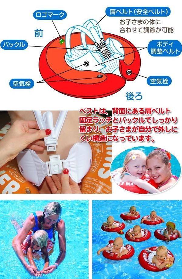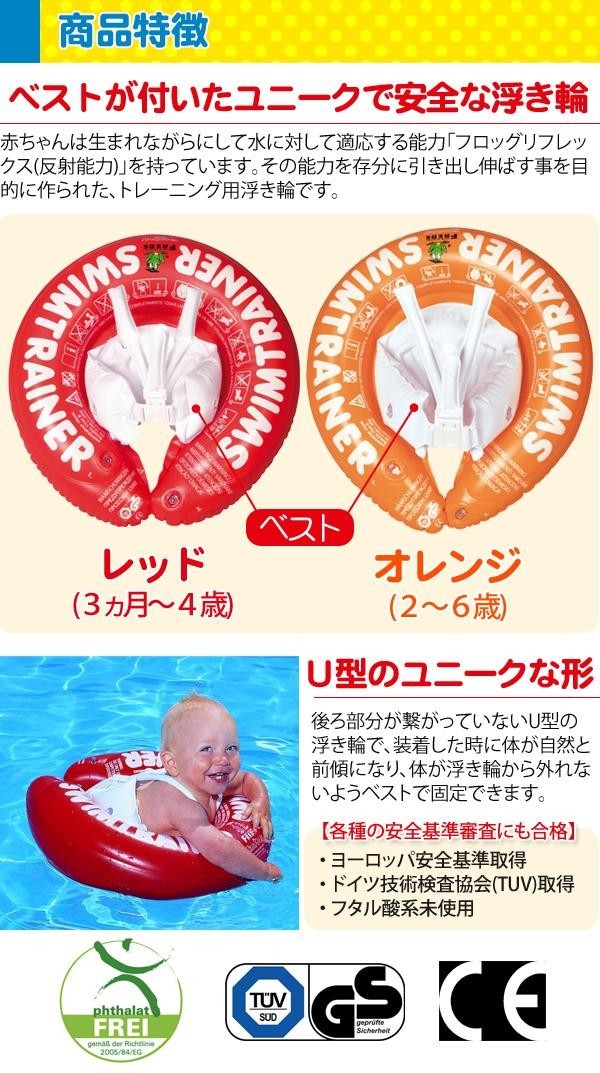 | 赤ちゃんは生まれながらにして水に対して適応する能力「フロッグリフレックス(反射能力)」を持っています。その能力を存分に引き出し伸ばす事を目的に作られた、トレーニング用浮き輪です。後ろ部分が繋がっていないU型の浮き輪で、装着した時に体が自然と前傾になり、体が浮き輪から外れないようベストで固定できます。素材に赤ちゃんに有害なフタル酸系を使用しないなど、安全にこだわったつくりになっています。 |