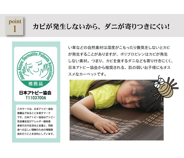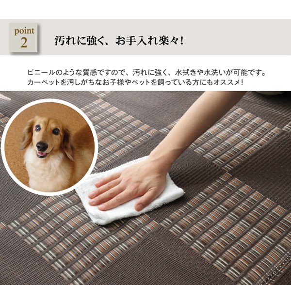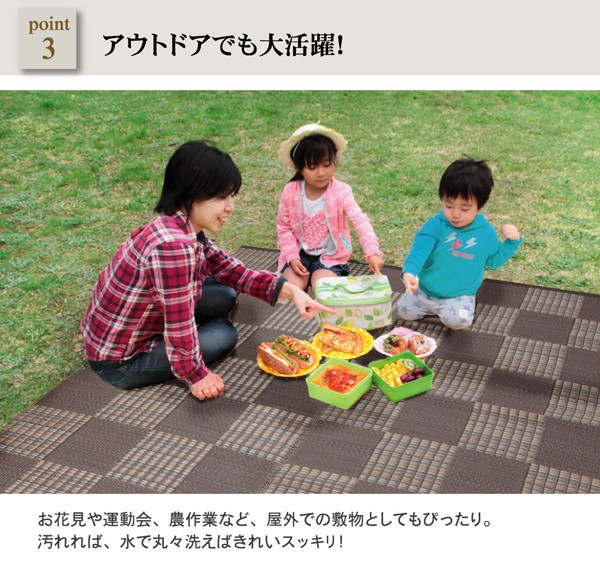 ポリプロピレン素材を細いパイプ状にして織り込んだ敷物です。強度が高くしっかりとしています。汚れても水洗いができるので、いつでも清潔にお使い頂けます。お子様の部屋に、アウトドアに、ペットのいるご家庭に最適な万能カーペットです。