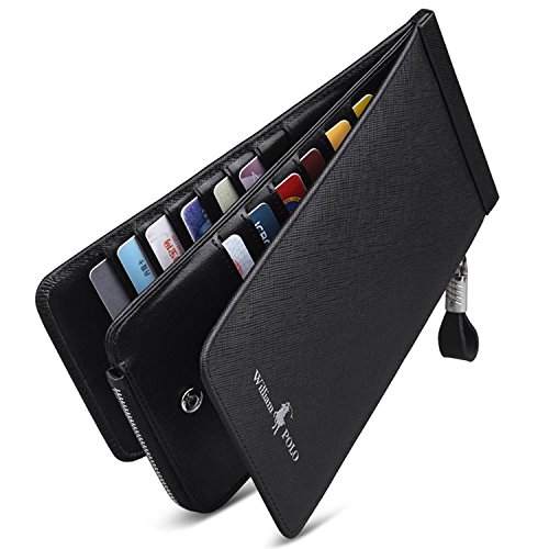 12 x Kartensteckplätze , 1 x Transparent ID Fenster, 1 x Große voller Länge Handytasche und Münzen , 2 x zusätzliche seitliche Fächer für Dokumente , 1 Fach mit Reißverschluss
