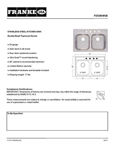 [Product Information]- This item is Franke Kindred FDG804N 22-inch x 33-inch x 8-inch Stainless Steel Gloss Finish D