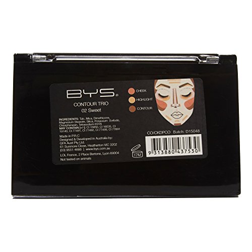 -. Binding : Health and Beauty -. Brand : BYS -. Feature : ILLUMINATE YOUR FACIAL FEATURES: Don't be fooled by how compact it is. You've got just enough to highlight your best, or minimize what you wish, at your fingertips, any time / NO MAKEUP LOOK: A contouring makeup that embraces your natural skin. The lightweight powder formula blends seamlessly and enhances your skin tone to provide a flawless, no-makeup look and feel / APPLY SOME CREATIVE LICENSE: Liberate your artistic side and have some fun! This trio palette features a cheek shade to add color and lift to your cheek bones, a highlighting shade to illuminate the high points on your face, and a contour shade to shadow and define your features / LONG WEARING: Achieve a dazzling coverage that stays in the face as long as your look is on. This contouring kit doesn't fade or leave creases, even if you wear it all day and night / SKIN FRIENDLY: Each palette features a safe and smooth consistency that perfectly complements all skin types and skin tones. A must-have in every girl's makeup kit! -. Label : BYS -. Manufacturer : BYS -. ProductGroup : Health and Beauty -. ProductTypeName : HEALTH_PERSONAL_CARE -. Publisher : BYS -. Studio : BYS -. Title : BYS Trio Powder Palette Lift Contour Highlight Compact Makeup Set (See More Shades)