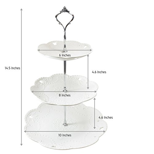 HIGH QUALITY STURDY AND STABLE - Each tiered plate is made of high-quality porcelain with smooth hand feel (easy to care for and wash). The tiers are connected with each other by solid pillars with screws for strength and stability. The stand is 14.5” tall. The plates are 6'', 8'', and 10” in diameter.