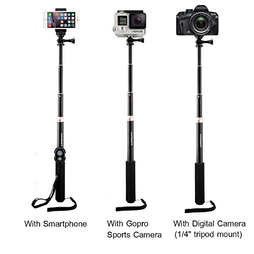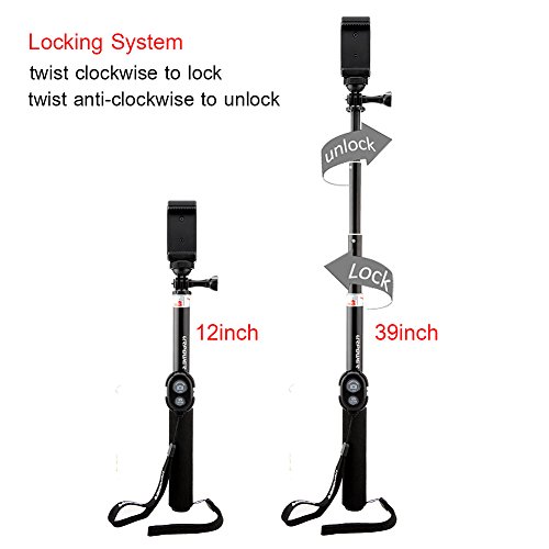 - Feature : NOTE: Unscrew the top to the right to extend the monopod, twist the top to the left to tighten the monopod. REMOTE CONTROL IS ONLY FOR SMARTPHONES. / COMPACT ACCESSORY WITH HUGE REACH - 12 (TIPS: PLEASE TURN OFF OTHER BLUETOOTH DEVICE AROUND, just make the selfie stick and your cell phone in Bluetooth connection only) / LIGHTWEIGHT AND EASY TO CARRY: The lightweight aluminum construction of the pole makes it incredibly light and easy to carry in a case or backpack. / EASY TWIST AND LOCK EXTENSION - FULLY ADJUSTABLE LENGTH: Twist and lock system allows you to adjust the length to ANYWHERE between 12 / PERFECT FOR: Digital Camera, Camcorder, Gopro Hero 4 3+ 3 2 1 Camera, Smartphone(iPhone 6 6+ 5S 5C 5 4S, Galaxy S6 Edge, S6, S5 S4 S3 Note 3 2, Nexus 4, HTC One, One 2 and Most Cell Phone).