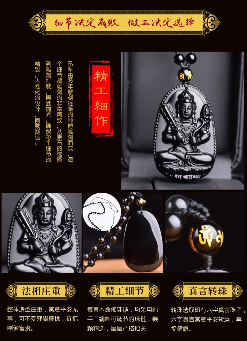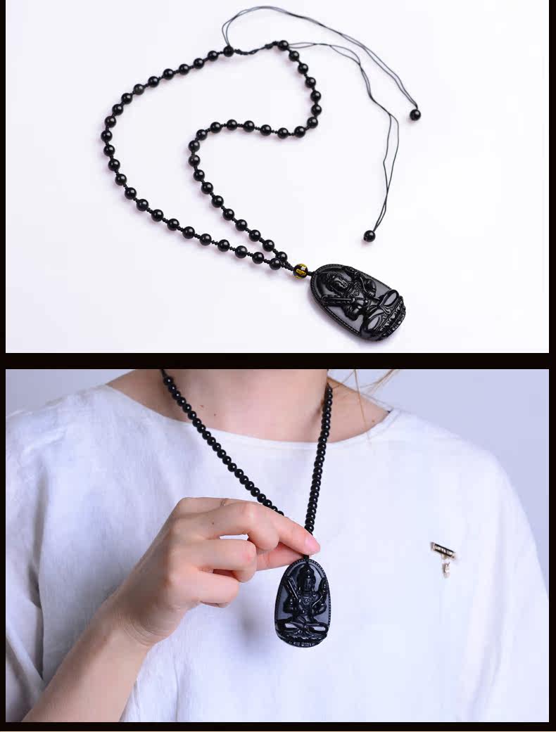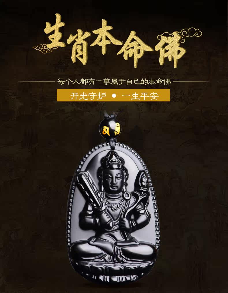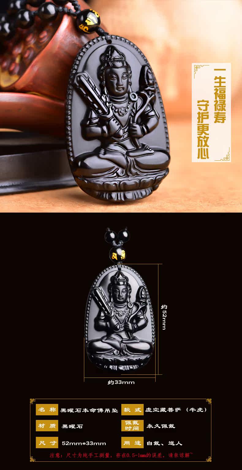 开光天然黑曜石生肖守护神吊坠 虚空藏菩萨属牛虎本命佛男女项链