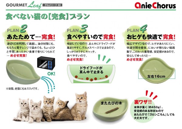 | 食欲旺盛な猫がいる一方で、病気でもないのに食が細く、だらだらとムラ食いをしたり、食べ残しては新しい食事をおねだりしたり、気まぐれな猫ちゃんにいつもやきもきします。食べない猫専用の食器「グルメリーフ50」は猫ちゃんの食事がもっとスムーズになるよう考えられた食器です。愛猫の健康促進と飼い主さんの負担が少しでも軽減される、それらのお手伝いが出来ればと思い開発しました。※くれぐれも肥満には注意してください。 |