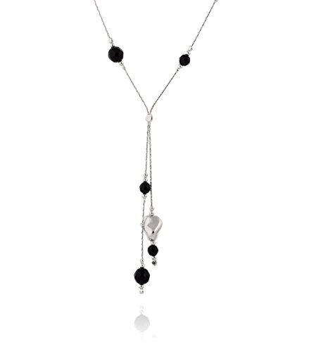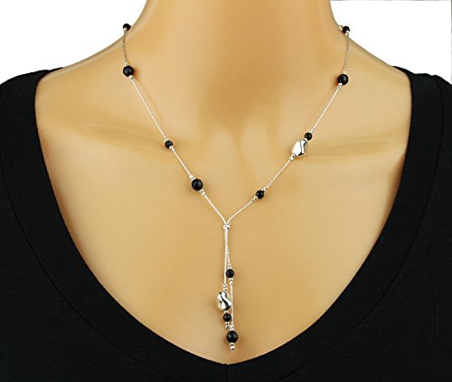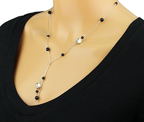 Exquisite black Onyx gemstone lariat necklace with two Sterling Silver free form nugget shaped beads. 925 Sterling Silver Y necklace with faceted black Onyx beads and Silver beads. The smaller black Onyx gemstone faceted beads measure 4 mm each and the larger beads measure 6 mm each. The free form Silver beads measure about 10 mm in length. Artisan handmade.