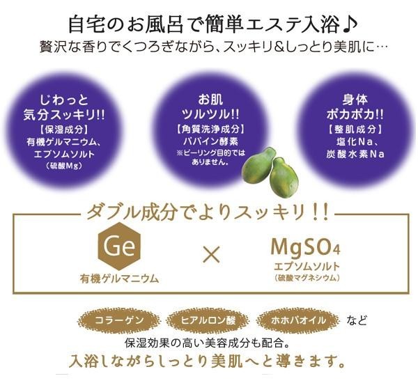 【ご使用方法】 ●浴槽の湯(約200リットル)に30~40g、付属のスプーンにすり切り3杯(約36g)を入れて、よくかき混ぜてから入浴してください。 ●40~42度のお湯で、10~15分程(30分以内)ゆったりと入浴することをおすすめします。 ゆっくり温浴することで、じわっとスッキリ!気分リラックス♪ ※入浴中は水分不足にならないようご注意ください。