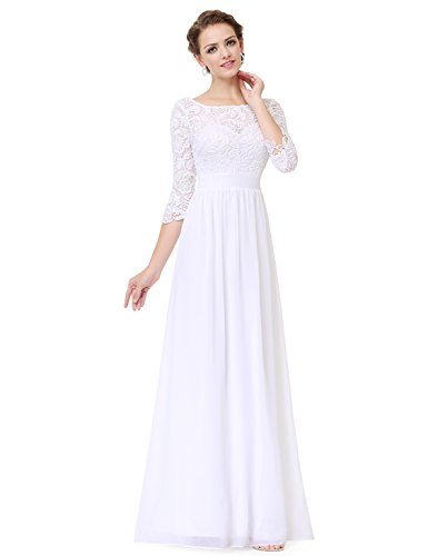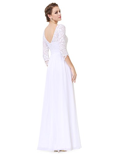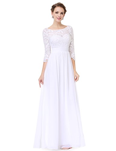 This stunning evening dress features a figure flattering ruched satin waist and a 3/4 sleeve lace bust. The formal floor length of the dress coupled with the classic white color makes this dress perfect for any affair; it has also been very popular with mothers of the bride and groom.