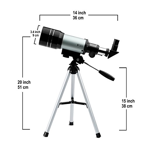 -. Feature : Perfect telescope for kids with tripod,portable to move and easy to use / Telescopes for astronomy beginners with tripod make the observation more steady,which provides a good environment to learning the nature and the universe. / View all the details of the craters on the moon with the H20mm eyepiece and moon mirror,use the H6mm eyepiece to viewing the terrestial objects on land. / H20mm,H6mm 2 options eyepiece,3X barlow lens,1.5x erector and moon mirror,300mm focla length,70mm objective diameter,1.5X erector lens,coated lens. / Powerful telescope for sky and land exploration,perfect gifts for your kids and astronomy beginners
